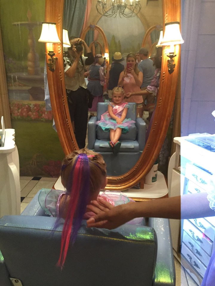 Bibbiti Bobbiti Boutique in Magic Kingdom- We were bringing a just turned 5 and an about to turn 4 year old girls to Disney World, in my opinion this is the best age to do Bibbiti Bobbiti Boutique. Granted, my almost 4 year old did not want to wear her dress because it was too itchy and hot… then she wanted it on…then she wanted it off… you know how it goes I’m sure. But, besides that, this was great. The girls chose 2 different hair styles and were able to sit side by side. We just chose the basic package (because it is pretty expensive especially when you are paying for two). In that package though they got their hair done, nails painted and make up put on by their own fairy godmothers. It was precious. They were able to keep all of the stuff they used plus they got a sash and backpack to keep it all in. I don’t think we would do this every time we go, but it was definitely a must do at least once.