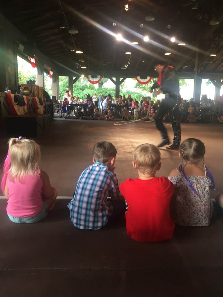 - Mickey’s Backyard BBQ located at Fort Wilderness Campgrounds- We stayed at Fort Wilderness this past time and will most definitely stay there from now on, but that is for a different post. Lol Knowing we were staying there, I made reservations for this character dining experience. To say the kids had fun would be an understatement. Mickey, Minnie, Goofy, Chip and Dale were there. They danced with the kids while a country band played on stage. After dancing for awhile, they left to form lines for autographs and a Cowboy came and did an amazing performance of lasso tricks. According to my children, they loved the lasso tricks even more than Mickey and Minnie being there. They didn’t even want to stand in line for autographs, they stayed and watched the cowboy. Overall, it was one of our very favorite dining experiences during this visit.