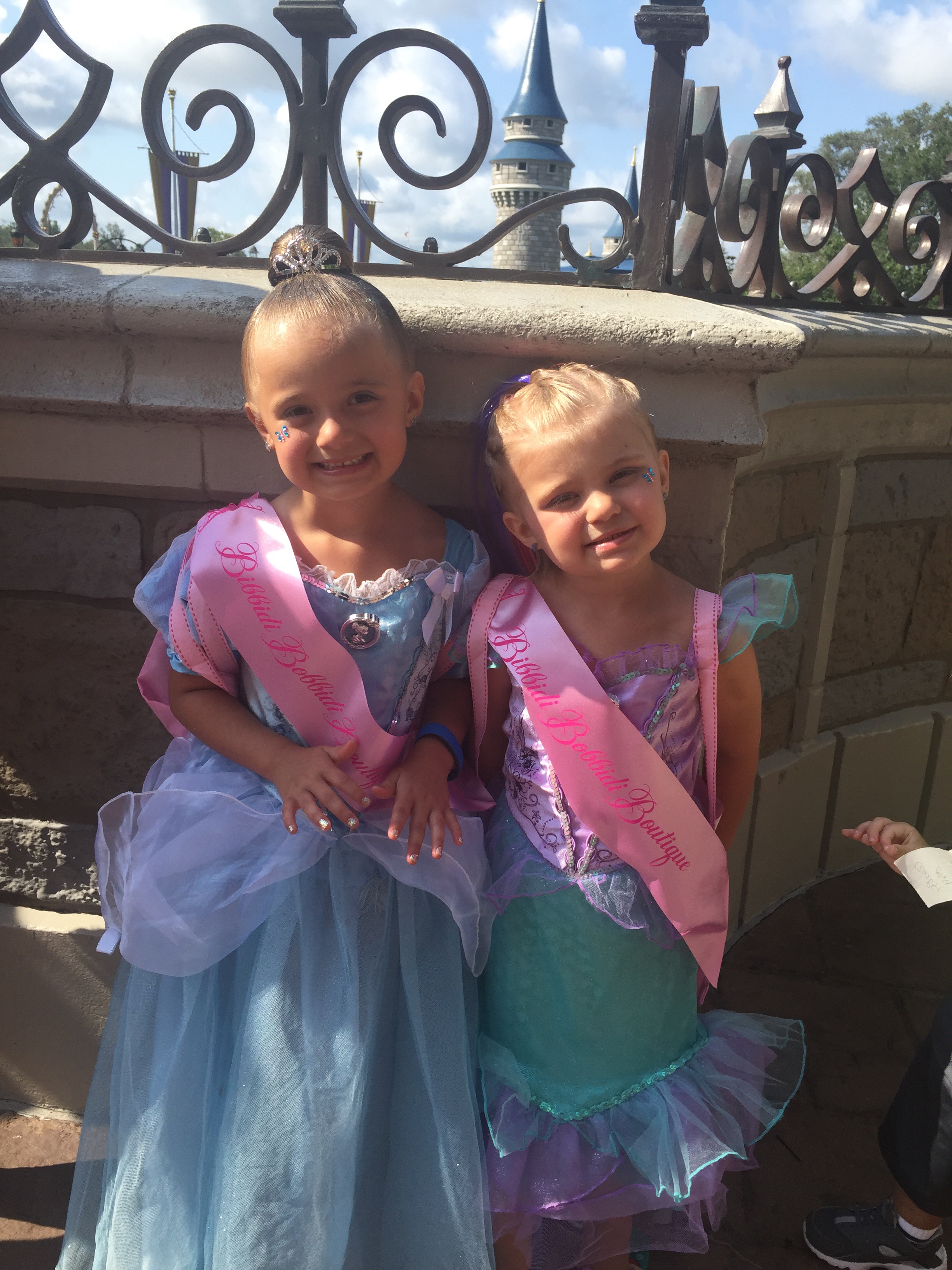 Bibbiti Bobbiti Boutique in Magic Kingdom- We were bringing a just turned 5 and an about to turn 4 year old girls to Disney World, in my opinion this is the best age to do Bibbiti Bobbiti Boutique. Granted, my almost 4 year old did not want to wear her dress because it was too itchy and hot… then she wanted it on…then she wanted it off… you know how it goes I’m sure. But, besides that, this was great. The girls chose 2 different hair styles and were able to sit side by side. We just chose the basic package (because it is pretty expensive especially when you are paying for two). In that package though they got their hair done, nails painted and make up put on by their own fairy godmothers. It was precious. They were able to keep all of the stuff they used plus they got a sash and backpack to keep it all in. I don’t think we would do this every time we go, but it was definitely a must do at least once.