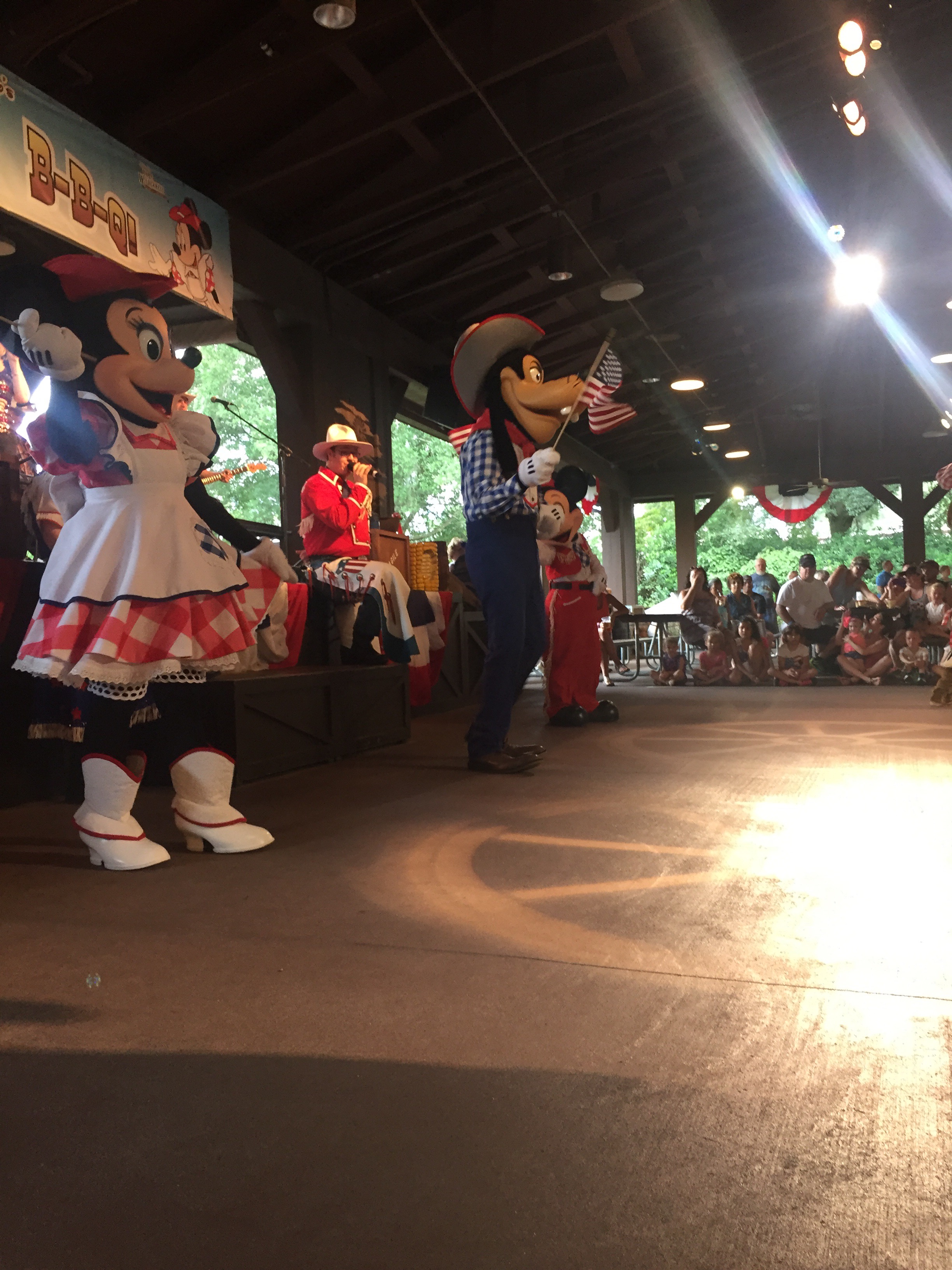 - Mickey’s Backyard BBQ located at Fort Wilderness Campgrounds- We stayed at Fort Wilderness this past time and will most definitely stay there from now on, but that is for a different post. Lol Knowing we were staying there, I made reservations for this character dining experience. To say the kids had fun would be an understatement. Mickey, Minnie, Goofy, Chip and Dale were there. They danced with the kids while a country band played on stage. After dancing for awhile, they left to form lines for autographs and a Cowboy came and did an amazing performance of lasso tricks. According to my children, they loved the lasso tricks even more than Mickey and Minnie being there. They didn’t even want to stand in line for autographs, they stayed and watched the cowboy. Overall, it was one of our very favorite dining experiences during this visit.