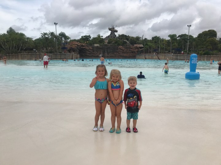 Pros: Typoon Lagoon is a Disney Water Park that covers 61 acres and is near the Disney Springs area. It has a huge wave pool where on occasion a boat horn blows and a huge wave comes crashing into the “shore”. Because the pool is so large, you still have plenty of space from other guests. The pool area is surrounded by a beach with sand and chairs to lay out in the sun. Since we all know I have three kids, this really wasn’t utilized by me, but they do have them! You can also rent a cabana to get out of the sun. We opted to not do this, which I feel was a good decision because there was so much to do, you don’t sit down much. As you walk around the pool you run into several different water slides. They have many different types of slides ranging from easy sliding to more extreme. They have a family slide there as well which was fun (well, Aris, my middle child hated it….but she hates anything “scary”). There are several different places to get food and drinks. Also, there is an awesome lazy river that circles the water park. It has water falls and sprayers and several different entry and exit areas.