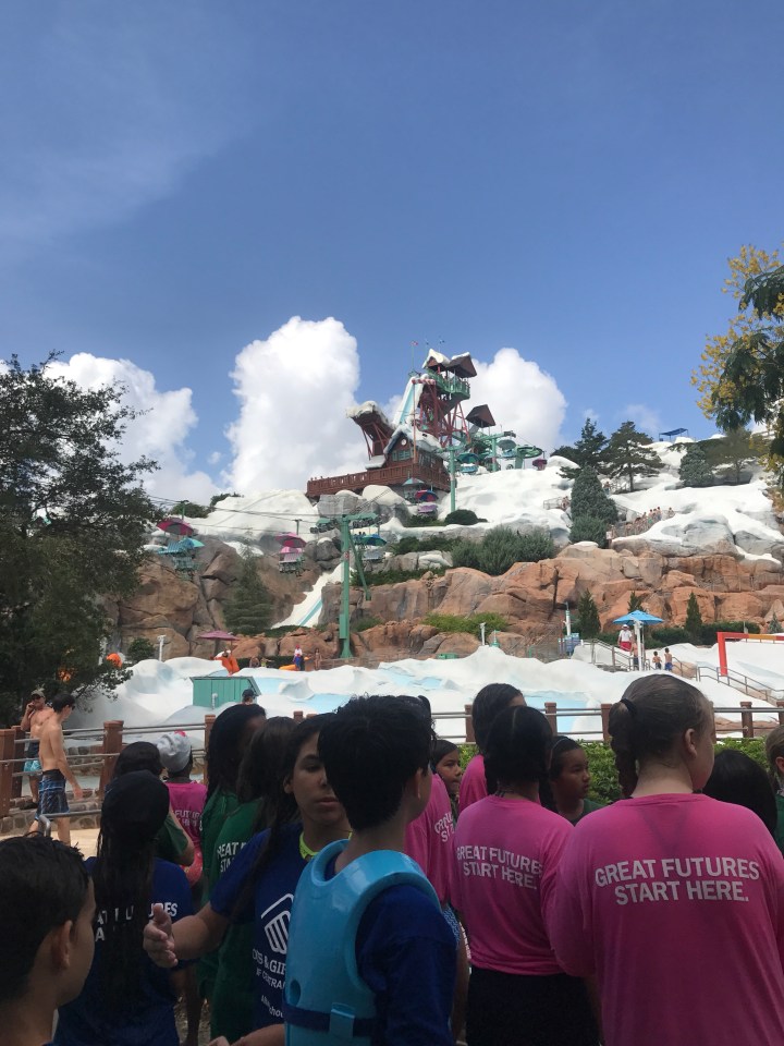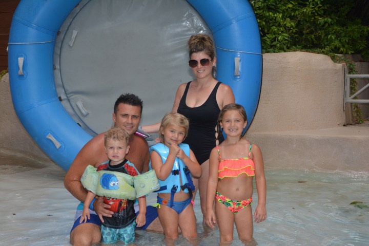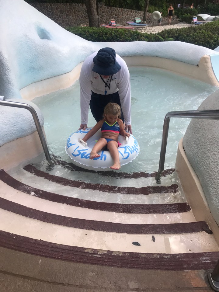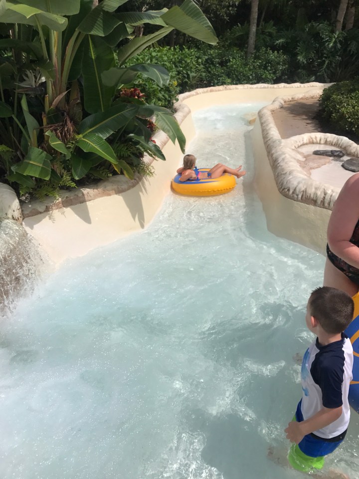 Pros: Blizzard Beach is located near Animal Kingdom and covers about 66 acres. Where as Typoon Lagoons “wow factor” is it’s giant wave pool, Blizzard Beach’s slides are what really makes this place unique. When you first walk in you see the Summit Plummet slide that looks like a ski jump. Though Lyra was ready to go, she was not tall enough (thankfully for her mother’s heart). However they had many other slides that my kids loved. The family slide at this water park holds up to 6 people and you don’t have to carry up the float. This was a total plus for us. This was my personal favorite activity there.