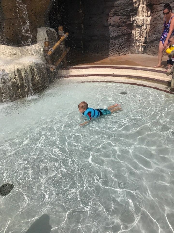 Aris and Tennison’s favorite part though was the kiddie area, Tikes Peak. Once Tennison discovered it, he didn’t want to leave. It had straight slides, curving slides and one that you ride a float down. The wading area was a good depth where they could actually get down in the water. There were things to climb on and even chairs close by for the parents.