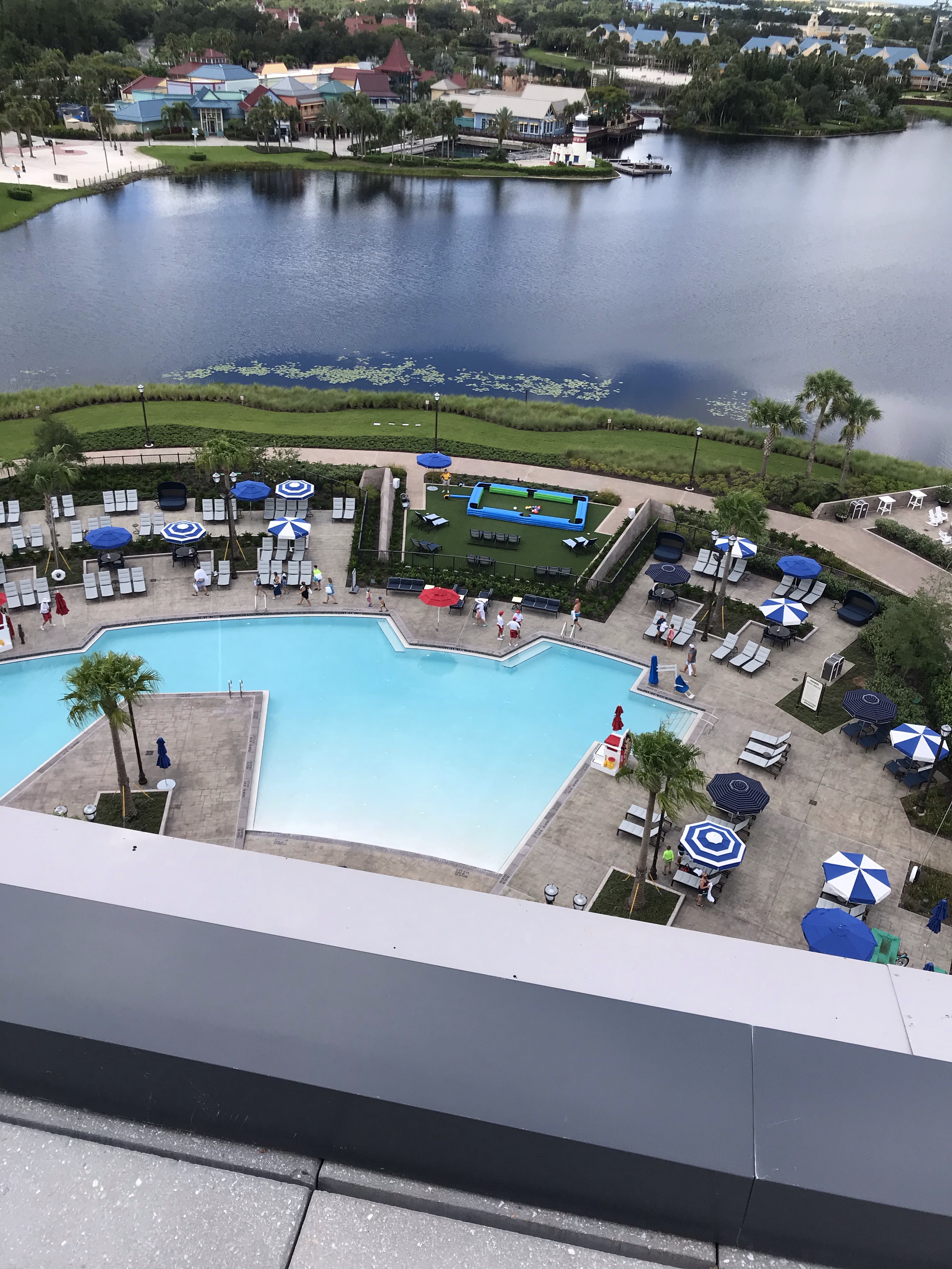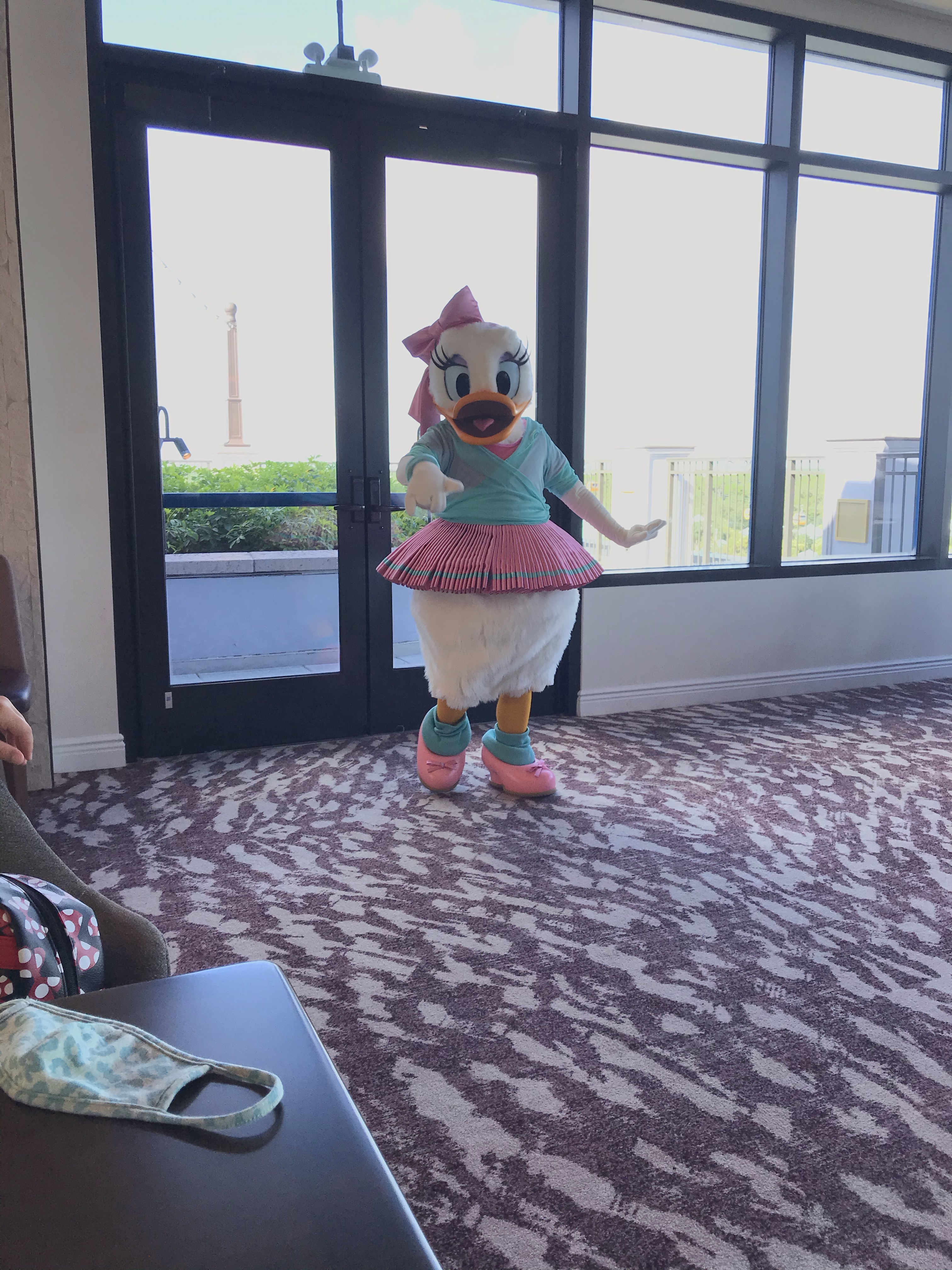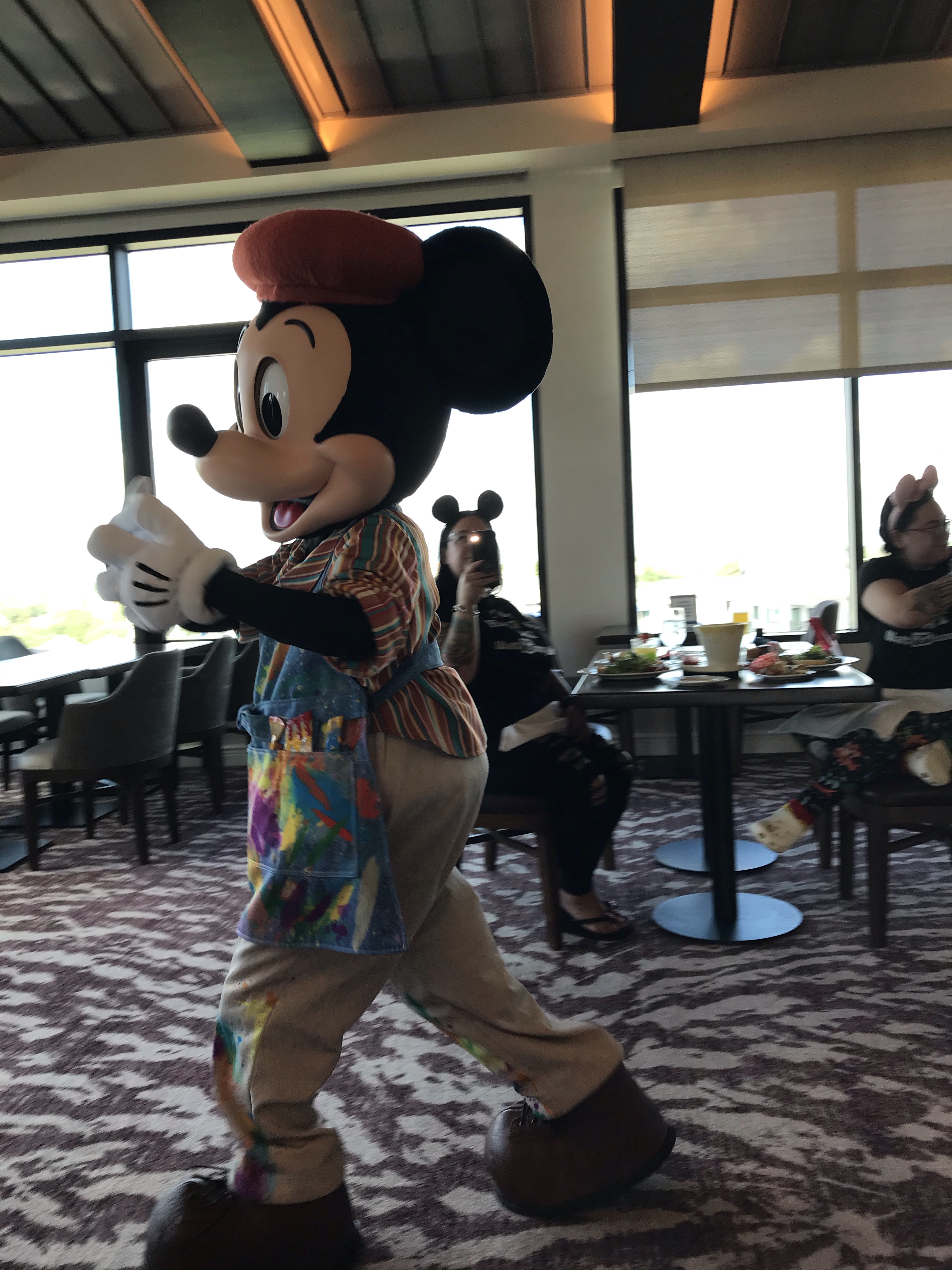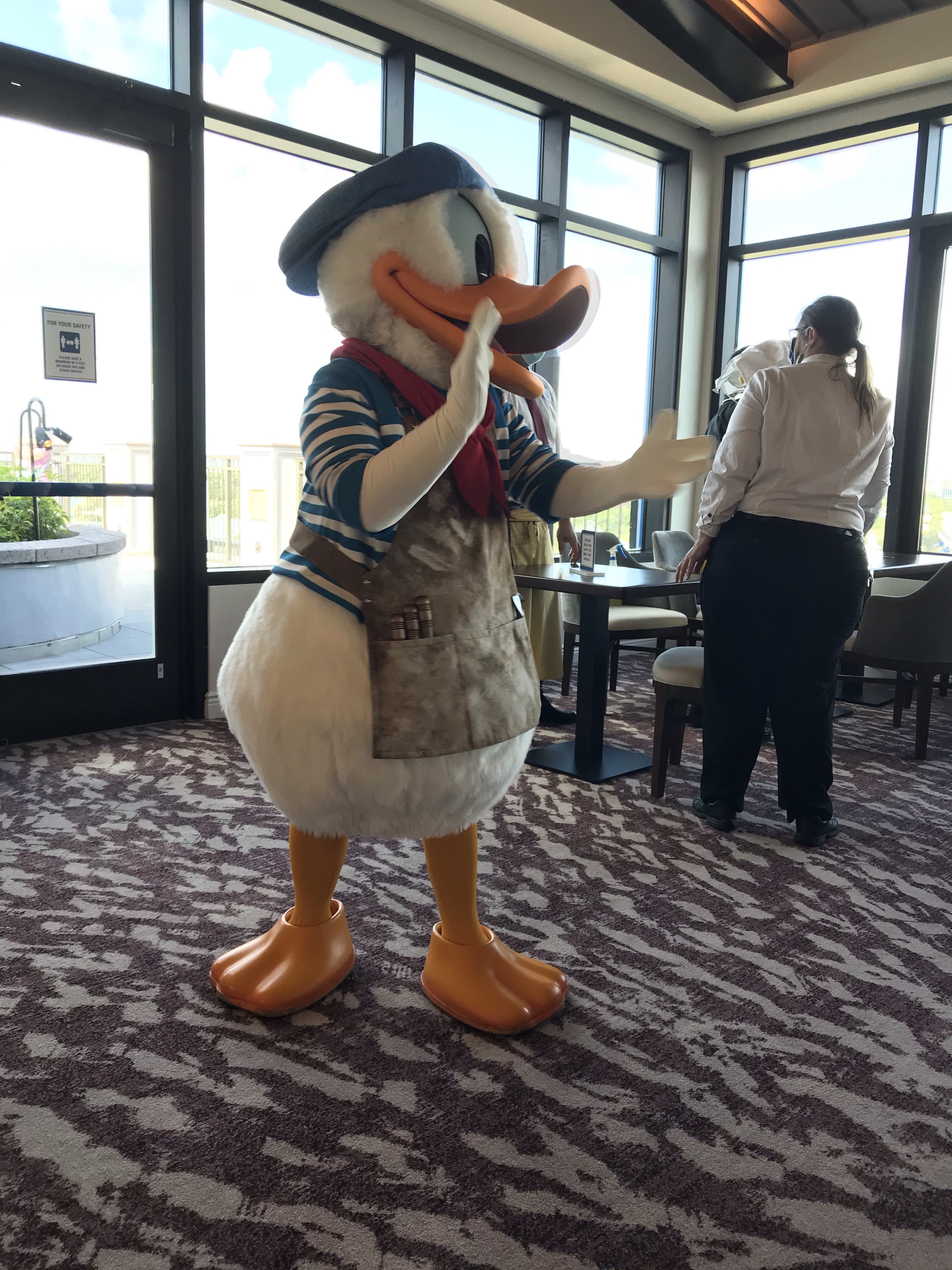 If you do need to wait a minute on your table, there is a seating area to the left of the entrance. In our experience, that seating area was filled so we were asked to wait to the right… which was the opening to the restaurant. Which was fine by us because we got to see the characters and sit by huge windows that looked down over that gorgeous resort! It wasn’t too long of a wait before we got our text saying our table was ready and we walked up to hostess stand to be seated.